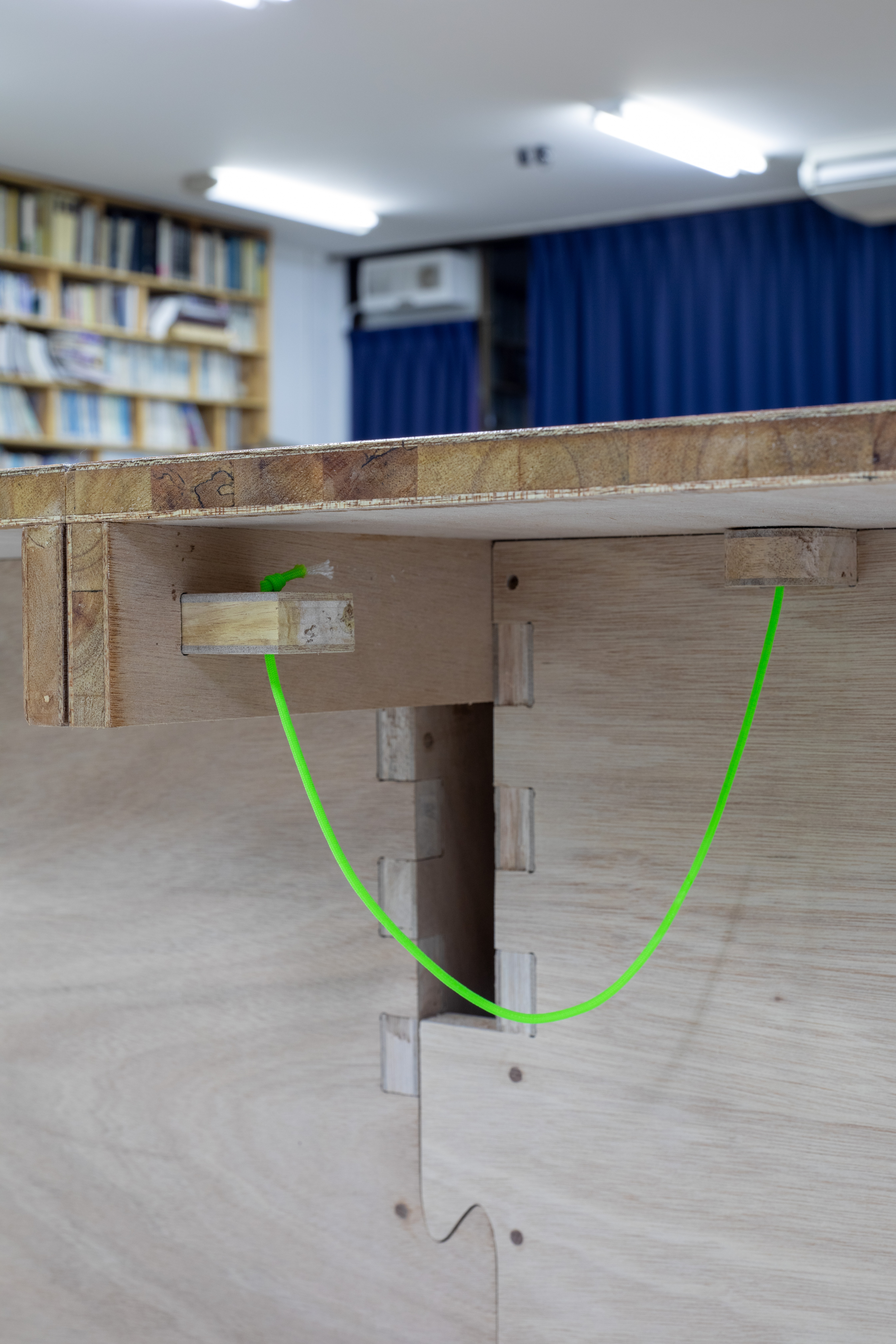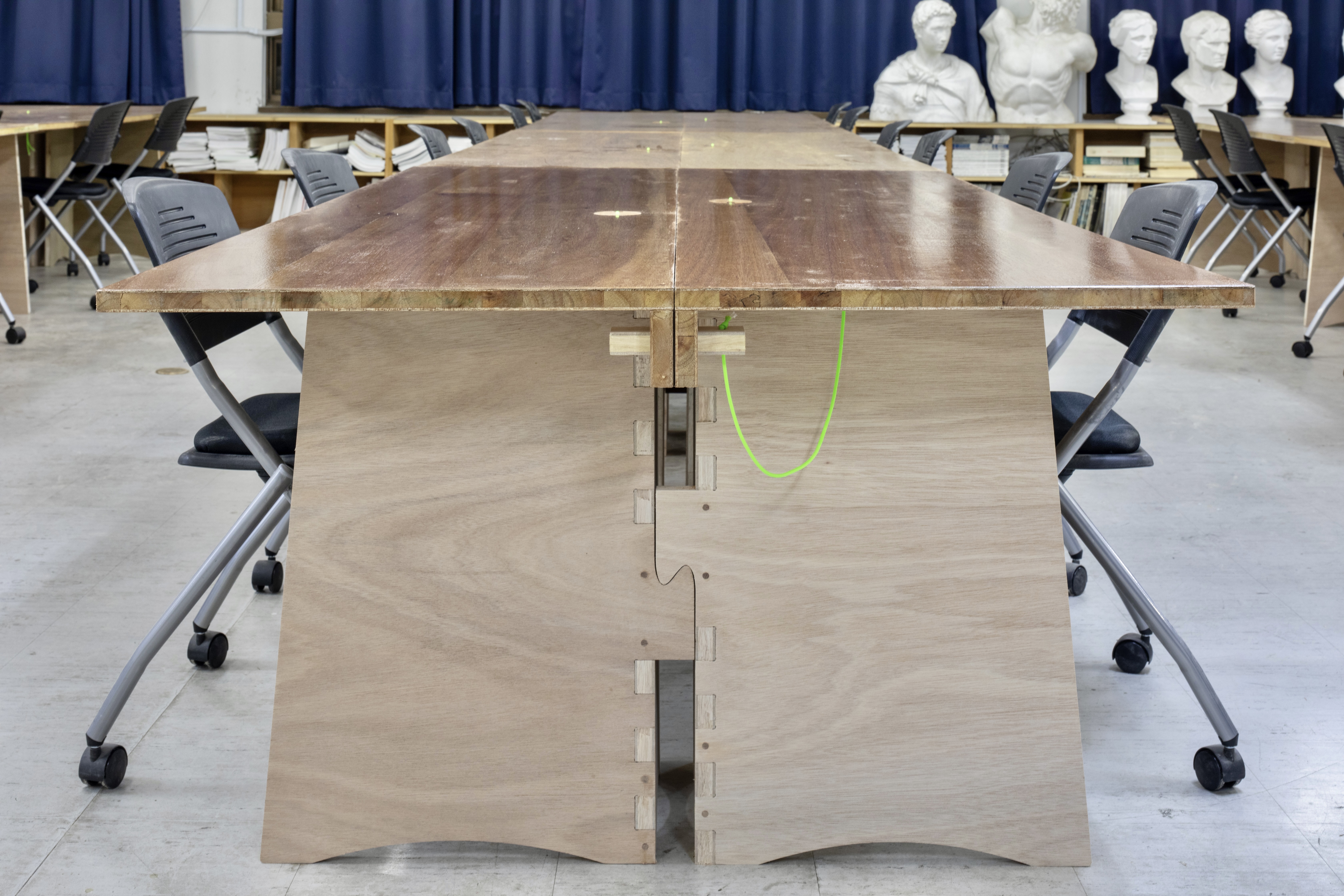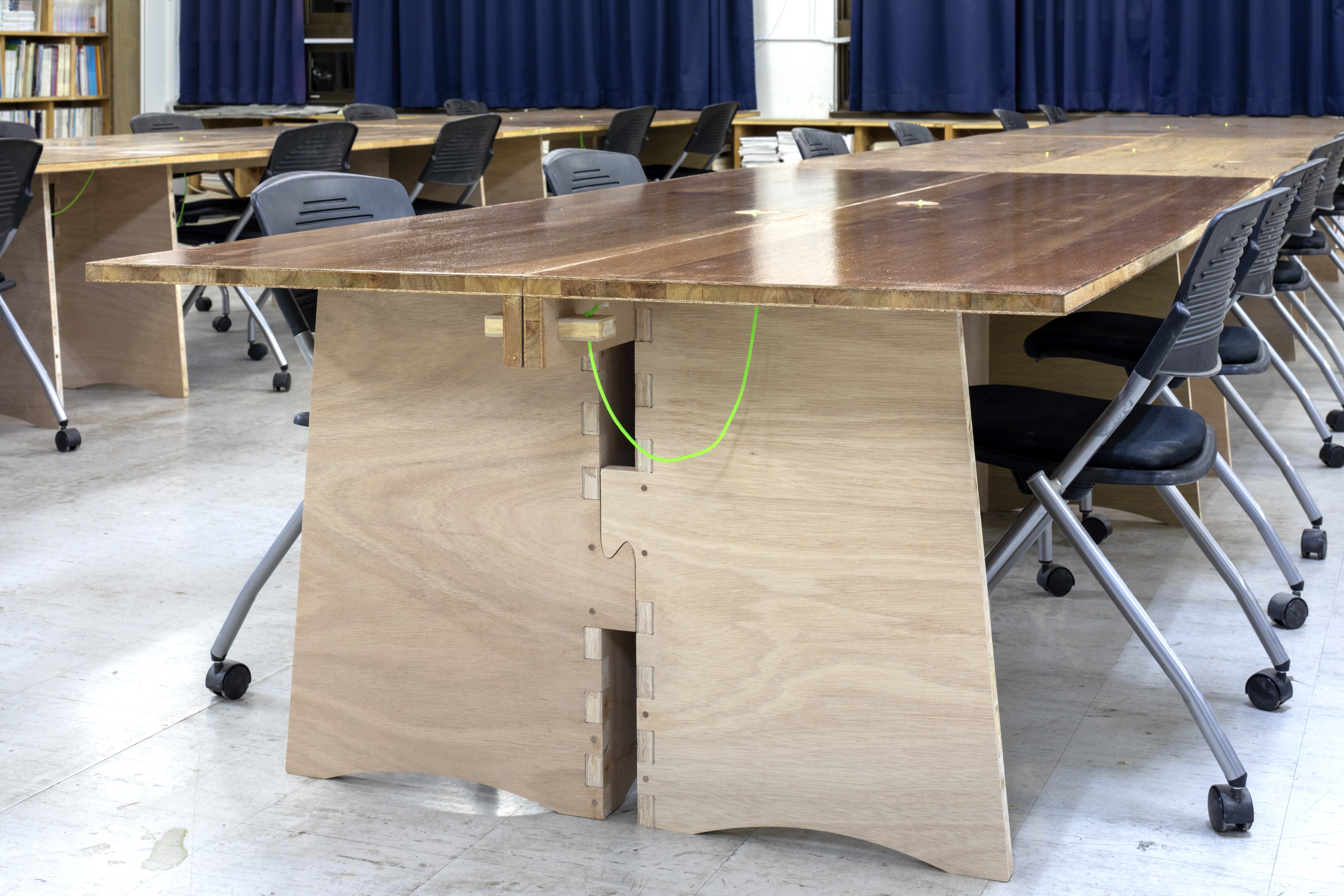 A work table for university facilities. Normally, it is a large workbench measuring 1220*2440mm, but during exhibitions, it can be split in half and used to display works.