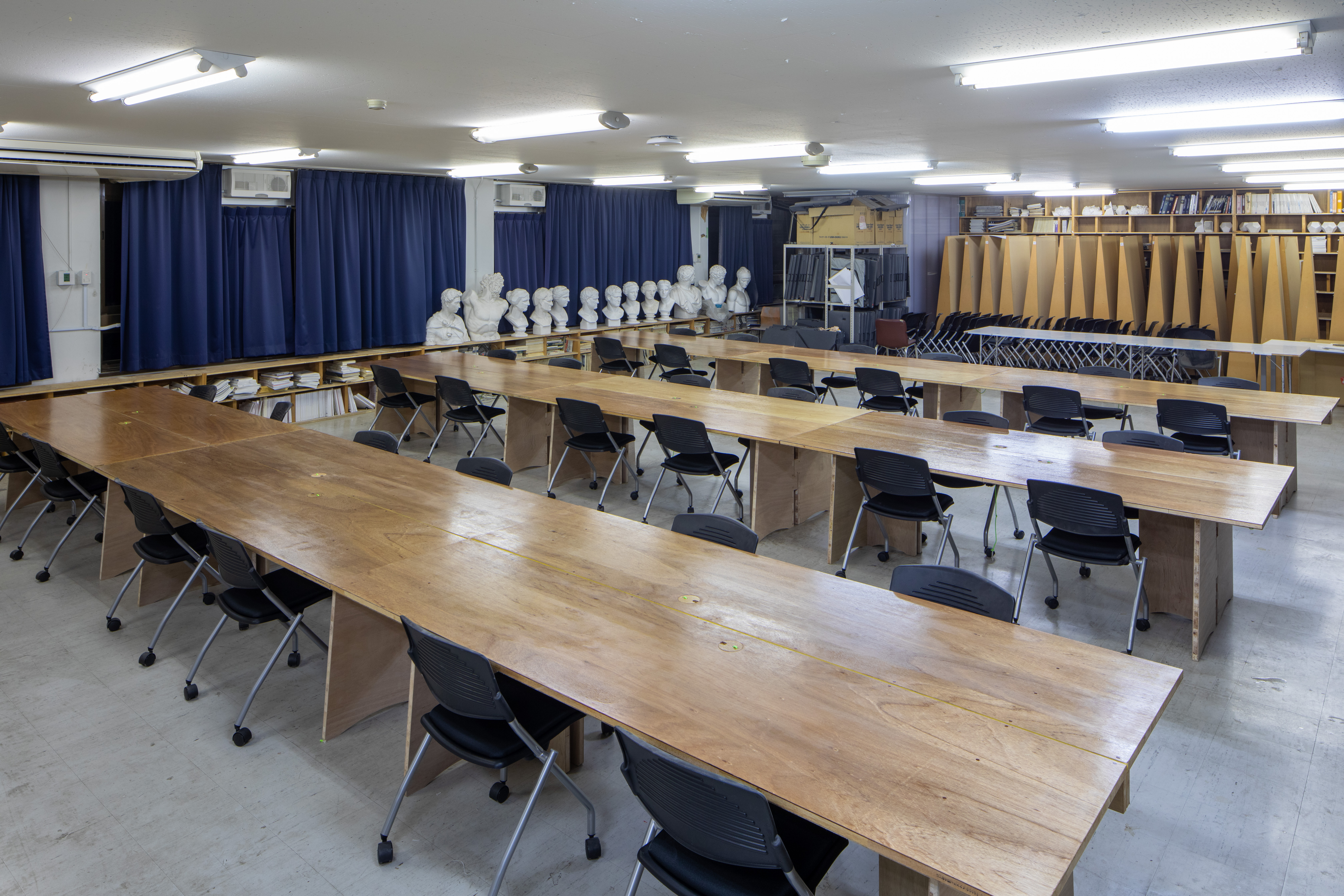 大学施設用の作業テーブル。通常時は1220*2440mmの大きな作業台, 展示時には半分に分割して作品の陳列に使用することができる。
