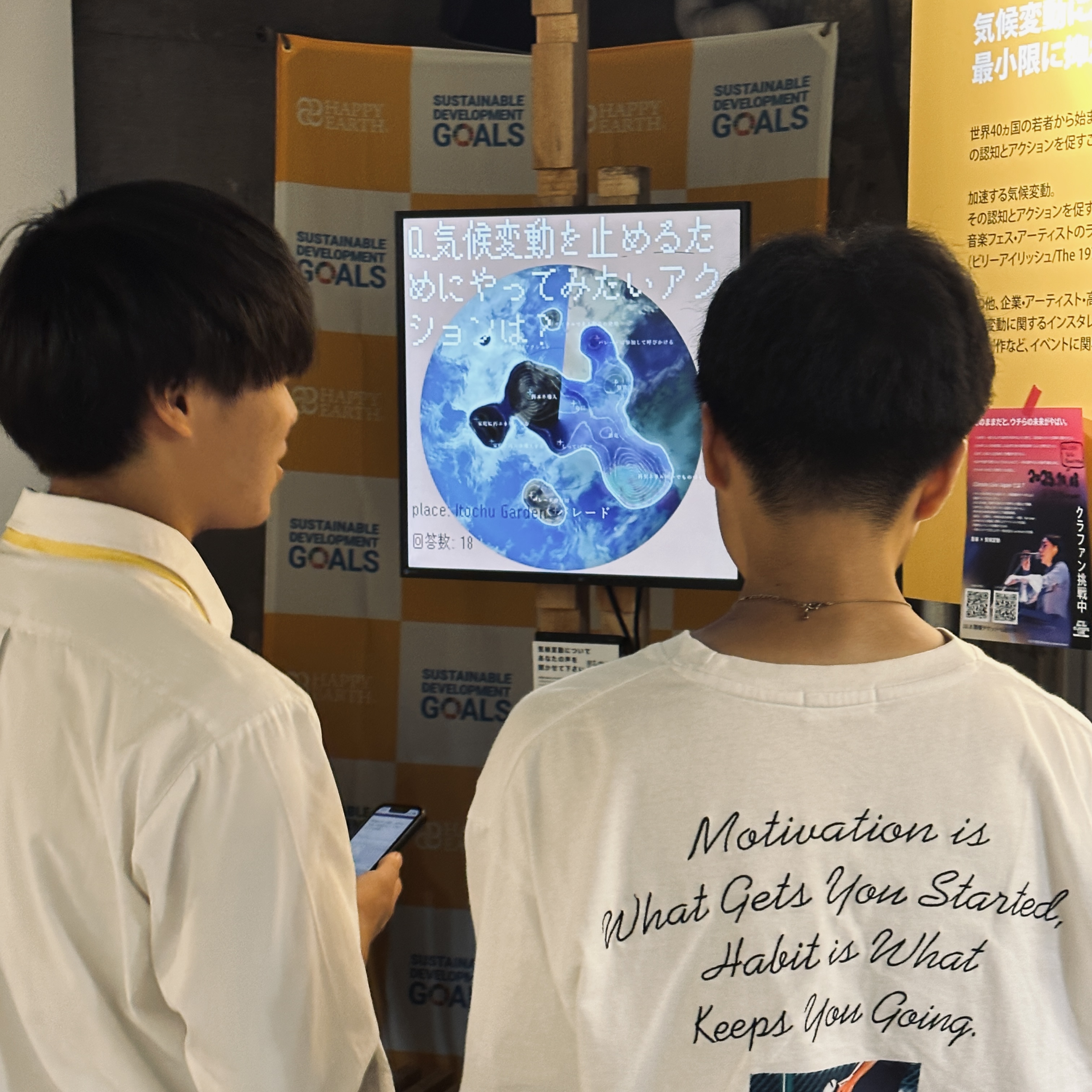 As an booth exhibition, highly dynamic environment where various people constantly come and go, what is the best way for visitors to deeply think about environmental issues?
